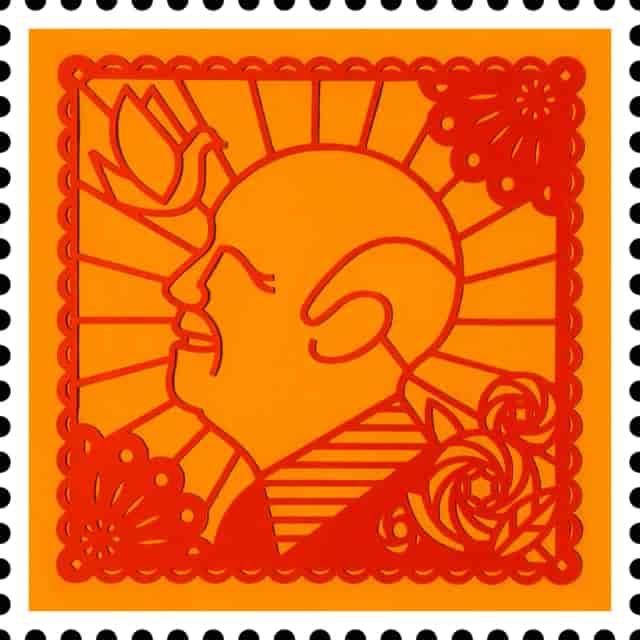 This portrait of Alfonso García Robles is inspired by the Mexican folk art tradition of papel picado. This art form involves hand-cutting intricate patterns into stacks of multicolored tissue paper and then hanging the artwork for display. The piece incorporates some of the common motifs of papel picado, such as flowers and birds, alongside the profile of Robles.
